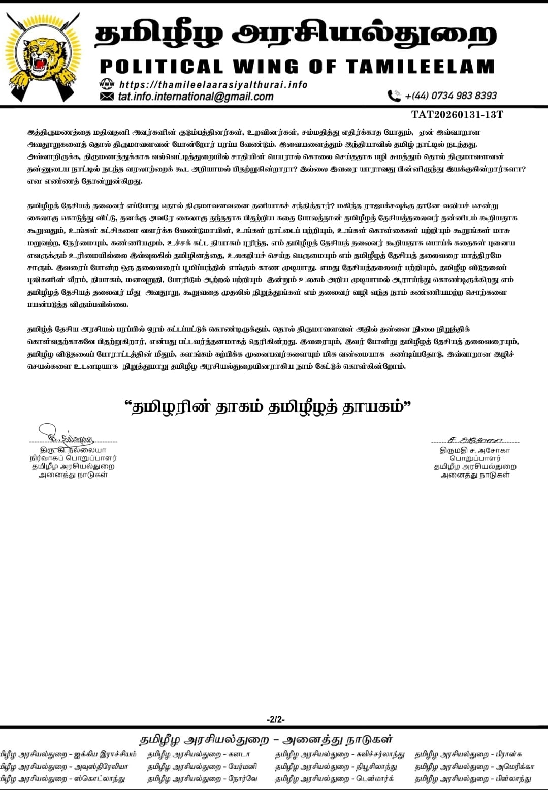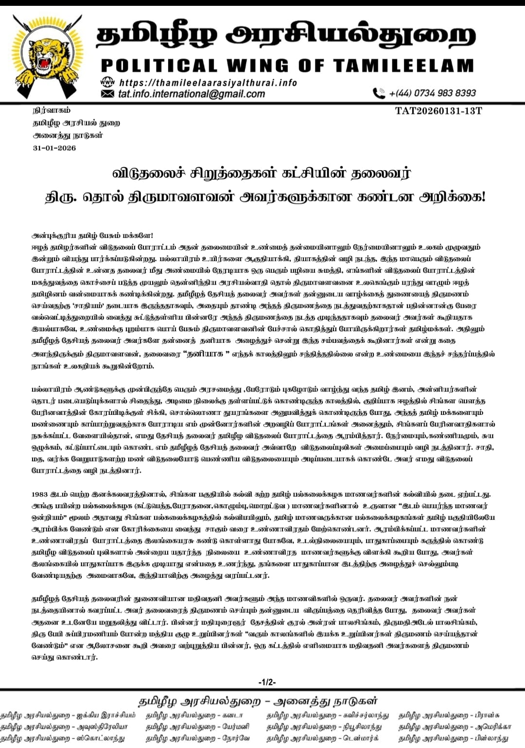 விடுதலைச் சிறுத்தைகள் கட்சியின் தலைவர் திரு. தொல் திருமாவளவனால் தலைவர் தொடர்பான அவதூறு பரப்பும் நோக்கில் இட்டுக்கட்டிய அண்மைய உரைக் கெதிராக, தமிழீழ அரசியல்துறையின் கண்டன அறிக்கை இங்கே பதிவிடப்படுகிறது.